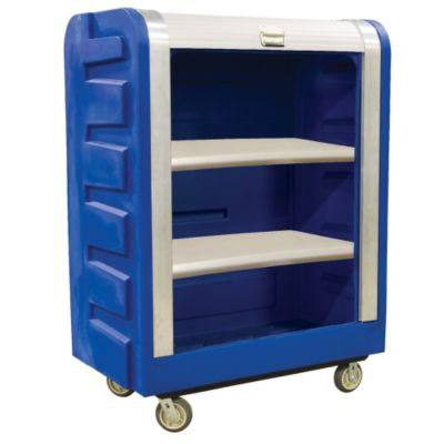 Locking tambour door provides secure storage and transport for your load. Tambour door slides easily along track and is less cumbersome than typical swing-out doors. Heavy-duty molded polyethylene body features a full-front cut-out for complete access and drainage slots for hauling damp loads. Body is supported by a solid steel base with durable powder coat finish. Entire unit rolls on 6" polyurethane casterstwo swivel, two rigid. Two removable plastic shelves are included. Read More..