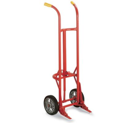 Self-standing feature lets WESCO Self-Standing Drum Truck stay vertical when not in use. Spring-loaded, floating axle cushions the load. Also includes replaceable nose prongs and wheels with 1" roller bearings and grease fittings. 16 1/2"W nose. Non-marking wheels. Read More..