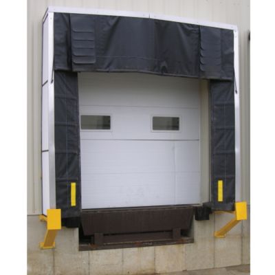 VESTIL Dock shelters conserve energy. For use with doors up to 10'W x 10'H. Reduces oversized doors to match truck opening. Long-wearing Vestex V-42 fabric is highly resistant to abrasion. Supporting structure is made of 2x4" treated lumber. Includes: top header piece with drop curtain, two vertical pieces with vertical flaps, safety yellow steel guide protectors, and foam-filled corner pads for extra sealing action. Read More..