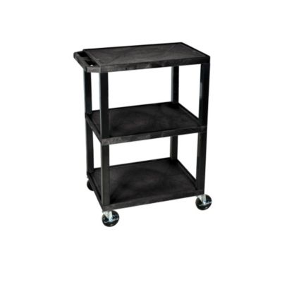 Easy to maintain H. WILSON Three-Shelf Utility Carts are available in eight color combinations to help you color-code your inventory. Injection-molded thermoplastic material will not rust, stain, scratch, or dent. Is a natural electrical insulator, as well. All carts have black square posts. Molded push handle maneuvers cart on 4" rubber swivel casters2 locking. Optional electrical assembly must be field installed. Ships unassembled. Read More..