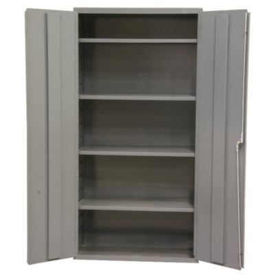 DURHAM Industrial Cabinets feature double doors that swing open 180 for complete access to contents. Full-height flush doors have full-length piano hinges. 6 5/8" wide door reinforcement adds strength. Three-point lock with keyed handle and 5/16" dia. lock rods. Shelves adjust on 4" centersno tools needed to install. Durable gray powder coat finish. Read More..
