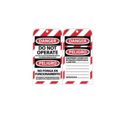 NMC Bilingual Danger Do Not Operate Lockout Tag has messages in English and Spanish. Prevents accidental or unexpected startup or release of stored energy when working on equipment and machinery. Include lined area for writing. .015 mil thick vinyl will not rip. Sold in packs of 10. Read More..