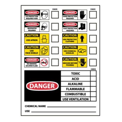 NMC Caution/Danger Chemical ID Labels allow you to customize the message by checking off the warnings that apply. Instruct employees on proper PPE and handling practices for hazardous materials. Pressure sensitive vinyl material. Comply with OSHA regulations. Sold in packs of 10. Read More..