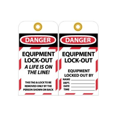 NMC Danger A Life Is On The Line Lockout Tags convey lockout directions and safety information. Prevents accidental or unexpected startup or release of stored energy when working on equipment and machinery. .015 mil thick vinyl will not rip. (A) has a lined area to write information. (B) includes a checklist. Sold in packs of 10. Read More..