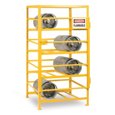 Unique LITTLE GIANT Gas Cylinder Cage is designed specifically to store industrial lift-truck propane tanks. Steel cage has solid 12-gauge sloped top and lockable door (lock not included). Tanks cannot be removed when door is closed. Holds 20-, 33- and 44-lb. propane tanks horizontally. Includes high-visibility "Danger Flammable"sign and footpads with lag-holes for floor mounting. Durable powder-coat safety yellow finish. Helps meet OSHA 1910 requirements. Read More..