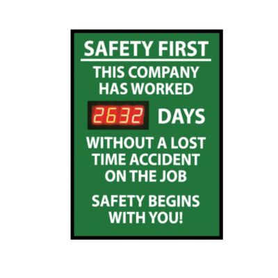 NMC No Accidents Digital Safety Scoreboards track safe working days electronically. Displays the number of days without a lost time accident on the job. Safe-day count stands out in brightly lit 2" red LED numbers. Eliminate the manual process of updating count information. Rigid plastic material. Read More..