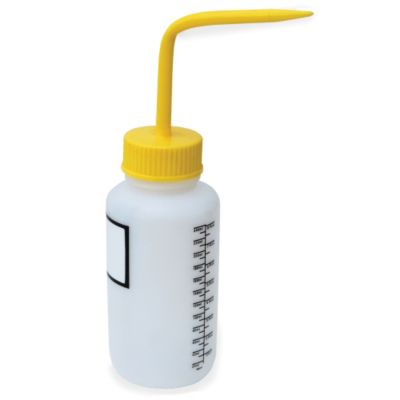 RELIUS SOLUTIONS Wide-Mouth Graduated Wash Bottles have a large opening for easy filling. Include a white label area that can be written on with a marker to clearly identify contents. Graduated in milliliters and ounces for quick content measurement. Translucent bottles have colored caps. Bottles are low density polyethylene (LDPE); caps are polypropylene (PP). Materials have been approved to meet FDA standards. Read More..