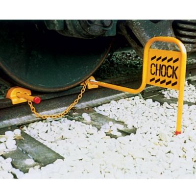 Rail Chocks have replaceable heat-treated steel spurs that grab rails to prevent slipping. Use on exposed rails only. For one directional stopping choose the single rail chock. Double rail chock is needed to stop in both directions (with rubber strap and hooks for greater tension). Meet OSHA regulations. Read More..