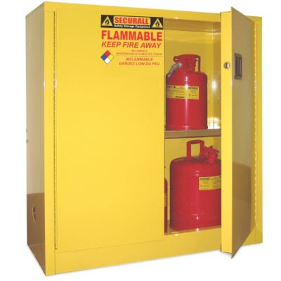 SECURALL Flammable Liquids Safety Cabinets help keep flammable liquids close to work areas in a safe and organized way. 18-gauge all-welded cabinets have double wall construction with 1 1/2" air space. 3-point self-latching doors have flush-mount locking handle and red warning label that reads "FlammableKeep Fire Away" spanning both doors. Galvanized steel shelves and adjustable leveling legs. Other features include: 2" deep bottom leak-proof sill, (2) 2" vents with flash arrestors, static ground connections, and continuous piano hinge. FM-approved. Meets OSHA and NFPA Code 30 standards. Read More..