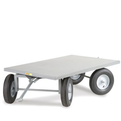 Use LITTLE GIANT Towable Trailer individually or link multiple trailers together for large loads. Pivoting axles are connected by a tie rod that turns the front and rear wheels in opposite directions. Maneuver easily in narrow aisles and around tight corners. 2 1/2" dia. ring drawbar hitches to pin and clevis hitch to connect multiple trailers. Rear hitch. Four 16" pneumatic wheels with 1" roller bearings. Boxed deck edges have reinforced understructure. Not intended for speeds over 5 mph. NOTE: Increased trailer loading or trailer quantity decreases braking capability of tow vehicle. Read More..