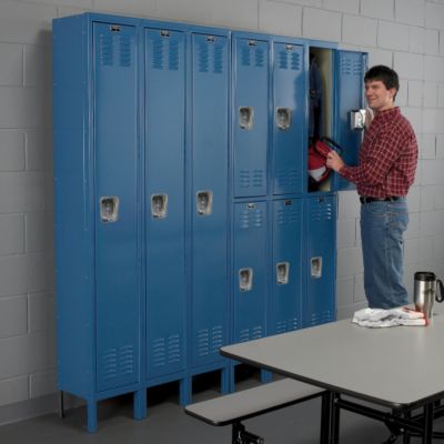 HALLOWELL Premium Lockers feature a continuous piano hinge on each door for smooth opening and closing. 16-gauge steel door and frame; 24-gauge steel body. Doors open via a one-piece stainless steel recessed handle with 2-point lock. Recessed handle accepts padlocks and keyed locks. Includes ceiling hook and two wall hooks and 6"H legs. Number plates are included. Specify number at time of order, otherwise will start with #1. Others sizes and colors available, call for information. NOTE: burgundy and green mist lockers have neutral side(s) and back panels. Purchase decorative end panels for exposed row ends. Read More..