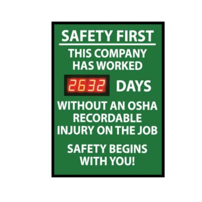NMC No Injuries Digital Safety Scoreboards track safe working days electronically. Displays the number of days without an OSHA recordable injury on the job. Safe-day count stands out in brightly lit 2" red LED numbers. Eliminate the manual process of updating count information. Rigid plastic material. Read More..